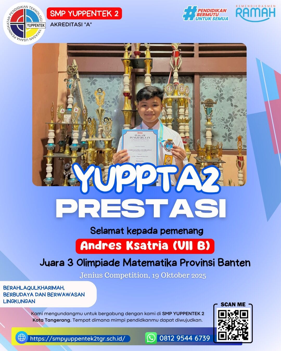 TANGERANG - SMP Yuppentek 2 Tangerang kembali menorehkan prestasi membanggakan di bidang akademik. Salah satu siswanya, Andres Ksatria (kelas VII...