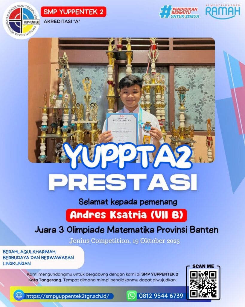 TANGERANG – SMP Yuppentek 2 Tangerang kembali menorehkan prestasi membanggakan di bidang akademik. Salah satu siswanya, Andres Ksatria (kelas VII B), berhasil meraih Juara 3 Olimpiade Matematika Tingkat Provinsi Banten dalam ajang Jenius Competition. Keberhasilan ini menunjukkan kualitas dan daya saing siswa SMP Yuppentek 2 Tangerang dalam kompetisi akademik tingkat provinsi. Andres mampu bersaing dengan […]